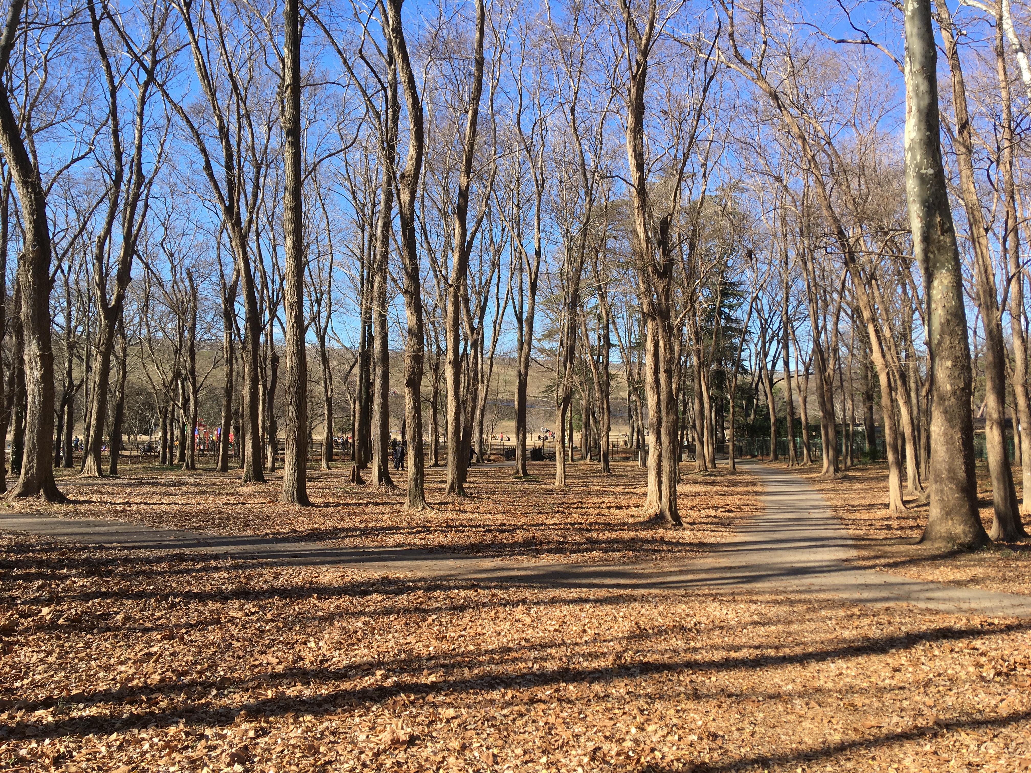 葉っぱを落とした木立の隙間から光が燦々と降り注いでいます。お天気の良い冬はとても明るい森です。
